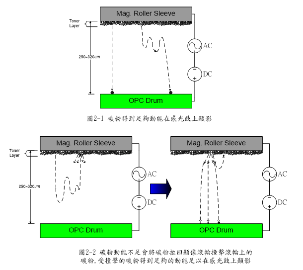 Canon 的跳躍式顯像機構專利是在感光鼓與顯像滾輪間隙中除了直流電場外,也加入交流電場;如此會讓有足夠電量的碳粉克服磁棒的磁力脫離磁棒直接在感光鼓顯影(圖2-1);若是帶電量不足或是太重以致動能不夠,脫離磁棒的磁力後無法直達感光鼓會因交流電場將碳粉拉回磁棒,並撞擊磁棒上的碳粉,受撞擊的碳粉得到動能以後,會飛向感光鼓達到顯影的目的。如此列印之光學密度(黑度)會較高。圖2-2顯示當碳粉動能不足會將碳粉拉回顯像滾輪撞擊滾輪上的碳粉,受撞擊的碳粉得到足夠的動能足以在感光鼓上顯影。跳躍式顯像機構使得粒徑分布過寬或過窄皆不適合碳粉顯像。表2-2說明影像輸出品質與碳粉大小的關係。