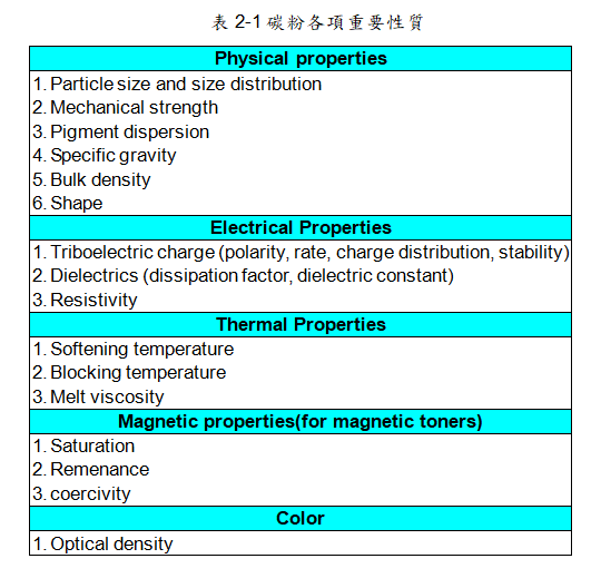 而碳粉研發必須與印表機性能各項條件相輔相成;由於碳粉的需求特性太過於繁雜,致使設計上會妥協某些性能,如最大光學密度等。 上述碳粉特性大致上可以分成物理特性、化學特性以及電性。而其性質不僅材料選取有關,而且與製造過程何儲存狀態皆有關。表2-1為碳粉各項重要性質列表。