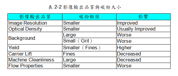 粒徑分布太寬容易造成碳粉佈電不均勻,也可能造成碳粉帶錯電(Wrong Side Toner);粒徑分布窄,雖然可以穩定的控制碳粉物理性質,卻因此造成列印張數過低。
