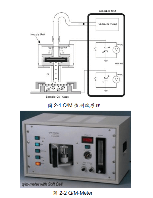 一般而言碳粉擦電性質會直接影響影像輸出品質(如黑度與底灰)、列印張數與載珠生命期。計算碳粉擦電性質的方式一般會使用Q/M值(即單位重量所帶的電荷),實驗方式是利用比碳粉還大的粉體(一般會使用載珠50~80μm),將兩種粉體均勻混合,當兩種粉體接觸碰撞後電荷即轉移,再將碳粉吹出留下另一種粉末,如此測的粉末電荷即可得到Q/M值。圖2-3為Q/M值測試原理。圖2-4為德國Epping Co. 的 Q/M-Meter。